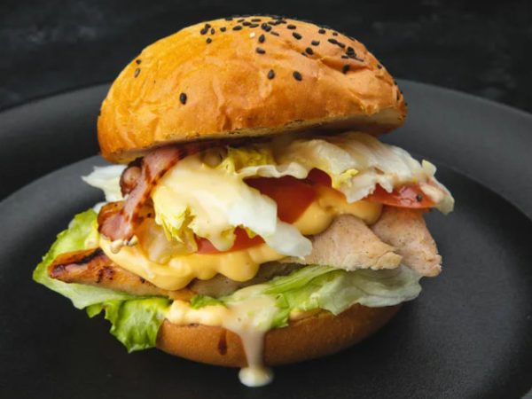 Соус цезарь, куриная отбивная, помидор, капуста пекинская, лист салата, парме — зан, булочка/225гр