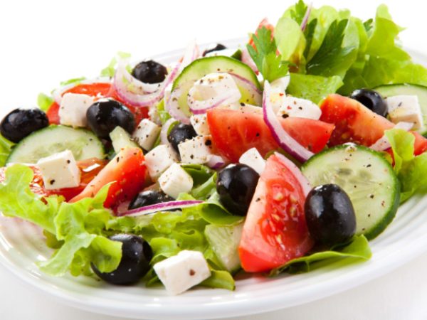Огурец, помидор, лук, перец болгарский, сыр фета, маслины, пряная заправка, лист салата / 250 гр /