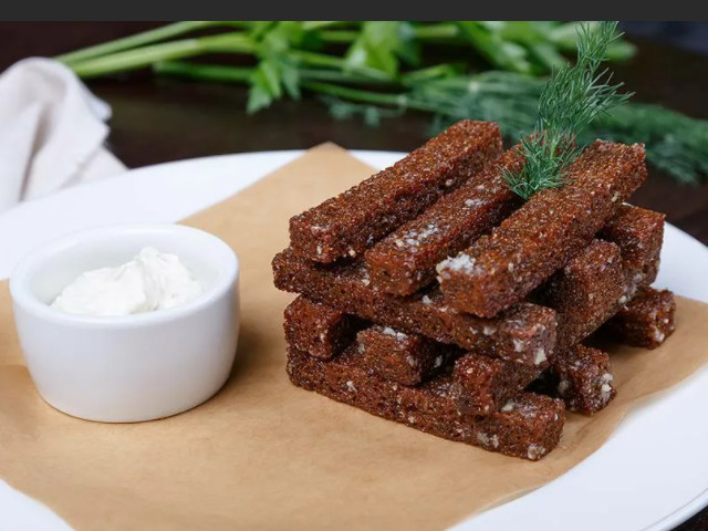 Черный хлеб, обжаренный во фритюре с пряным чесночным соусом / 80 гр