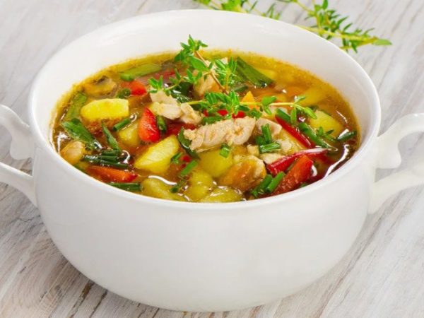 Куриный бульон, перец, лук, фасоль стручковая, зелень, морковь, курица / 350 гр