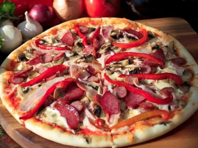 Соус фирменный, шампиньоны, бекон, ветчина, маслины, лук, салями, моцарелла, помидор, тесто