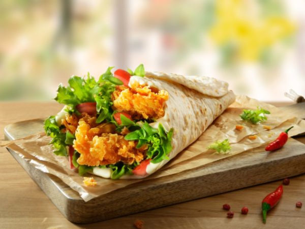 Фирменная лепешка тортилья, стрипсы, лист салата, помидор, соус фирменный/200гр